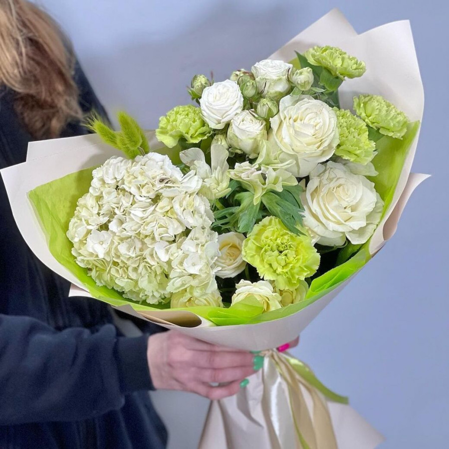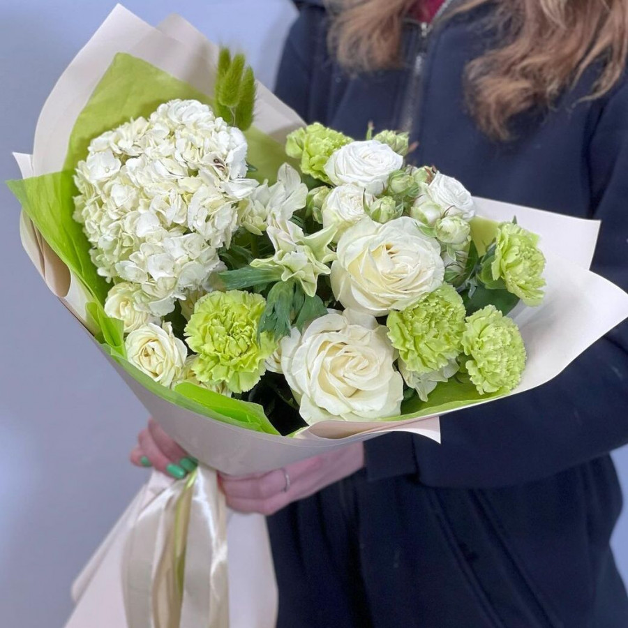 На фото букет из белой гортензии и белых роз. В составе: гортензия 1 шт, роза 3 шт, кустовая роза 2 шт, гвоздика 5 шт, крафт-бумага 1 шт, . Все цветы свежие и ароматные, букет красиво оформлен и отлично подходит для подарка. Доступна доставка цветов или самовывоз.