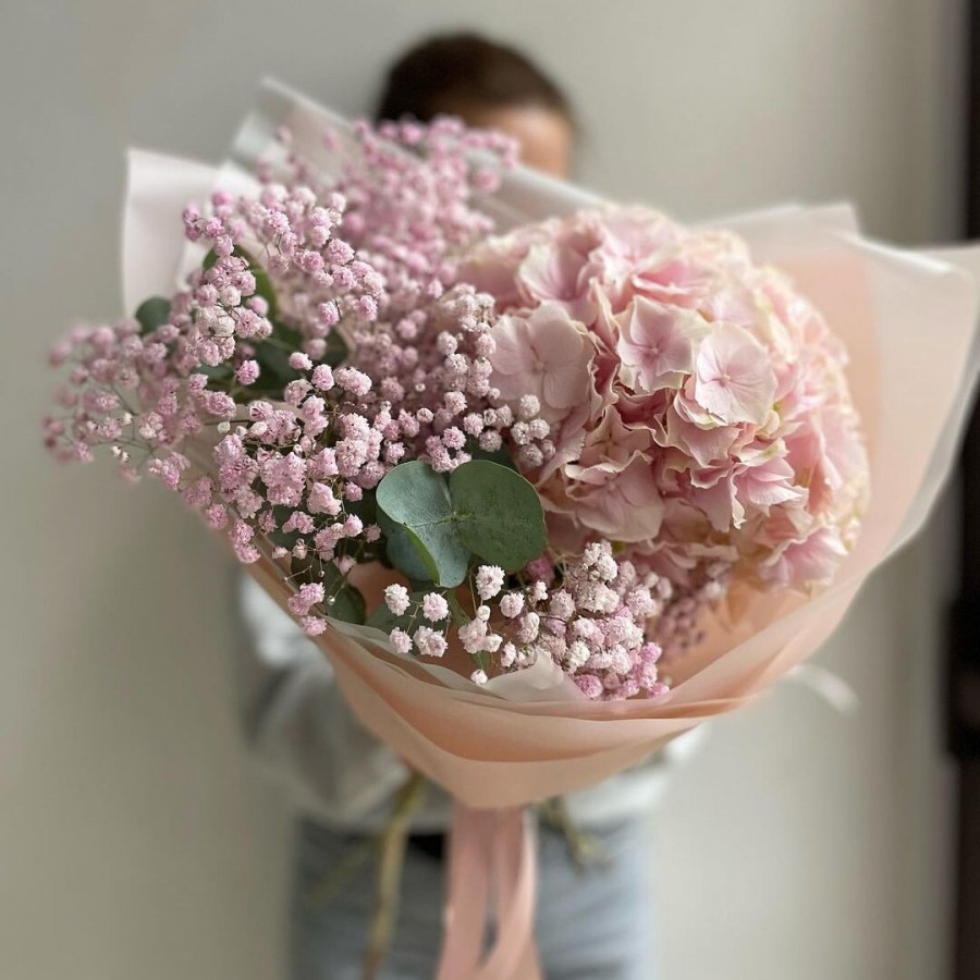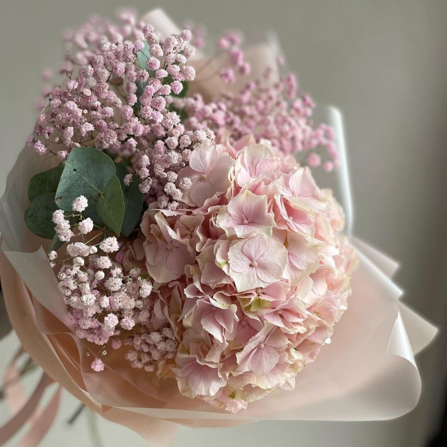 На фото букет из гортензий и гипсофилы. В составе: гортензия 1 шт, гипсофила 4 шт, эвкалипт 1 шт, крафт-бумага 1 шт, . Все цветы свежие и ароматные, букет красиво оформлен и отлично подходит для подарка. Доступна доставка цветов или самовывоз.