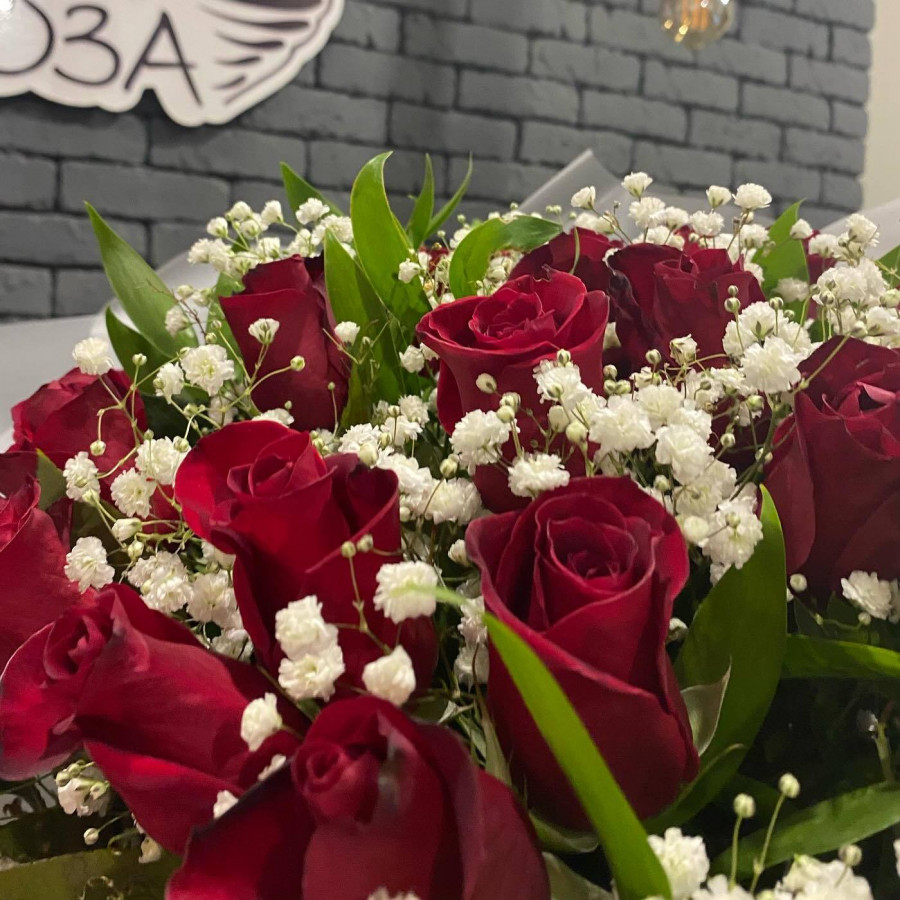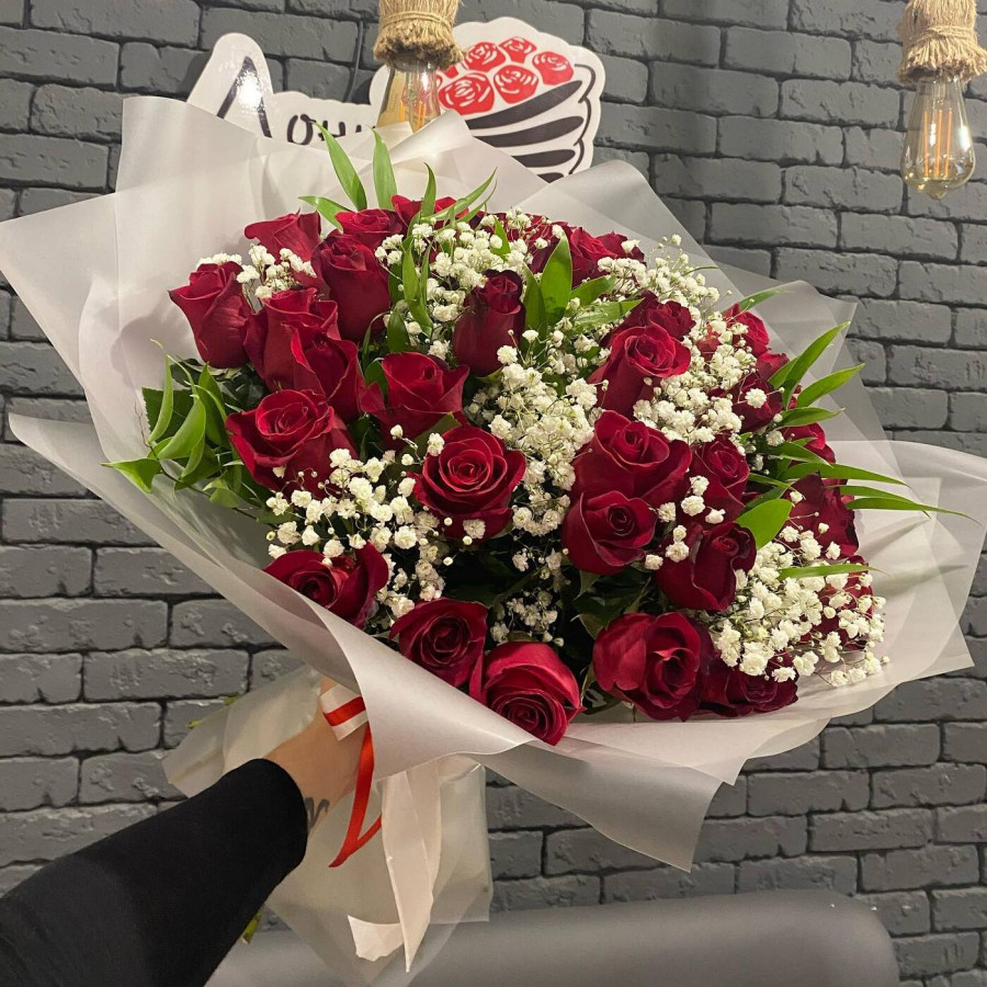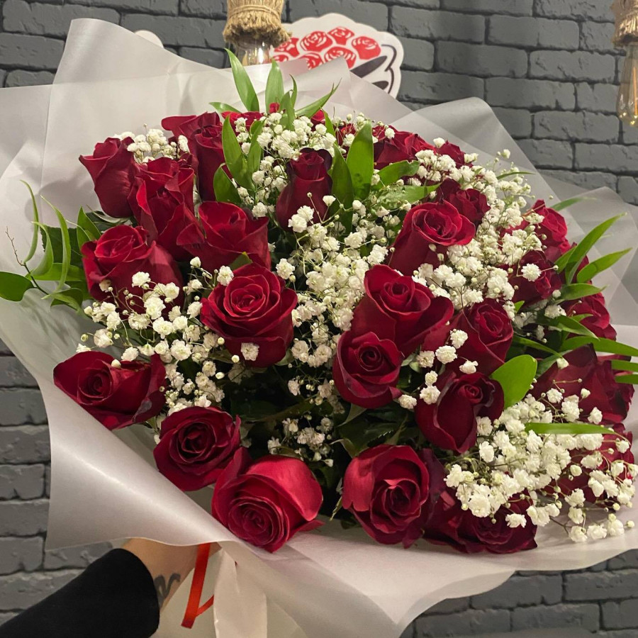 На фото букет из красных роз и белой гипсофилы. В составе: роза (кения) 35 шт, гипсофила 8 шт, крафт-бумага 1 шт, атласная лента 1 шт, . Все цветы свежие и ароматные, букет красиво оформлен и отлично подходит для подарка. Доступна доставка цветов или самовывоз.