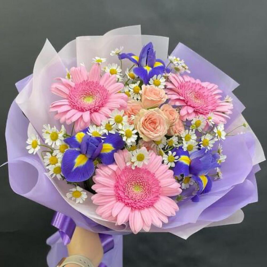 На фото букет «лиловый конфетти». В составе: ирис 3 шт, кустовая роза 1 шт, танацетум 3 шт, гербера 3 шт, дизайнерская упаковка 1 шт, атласная лента 1 шт, . Все цветы свежие и ароматные, букет красиво оформлен и отлично подходит для подарка. Доступна доставка цветов или самовывоз.